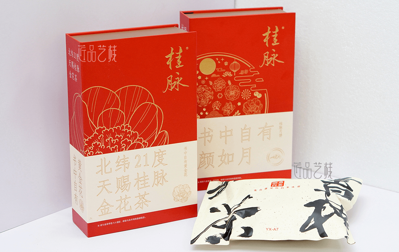 桂脈金花茶,廣西金花茶領導品牌。金花茶是上古時代遺留下來的原始山茶遺珍,在桂脈品牌金花茶設計定制中,佳潤隆包裝&匠品藝棧采用傳統書籍的創意形式,結合現代的印刷工藝和簡約風格,搭配質感紙質和內托精制而成;使整理禮盒呈現出中國韻味文化,同時又不失送禮時的低調輕奢品質,打開包裝,金花燦燦,寓意貴氣人脈來,送禮倍有面。