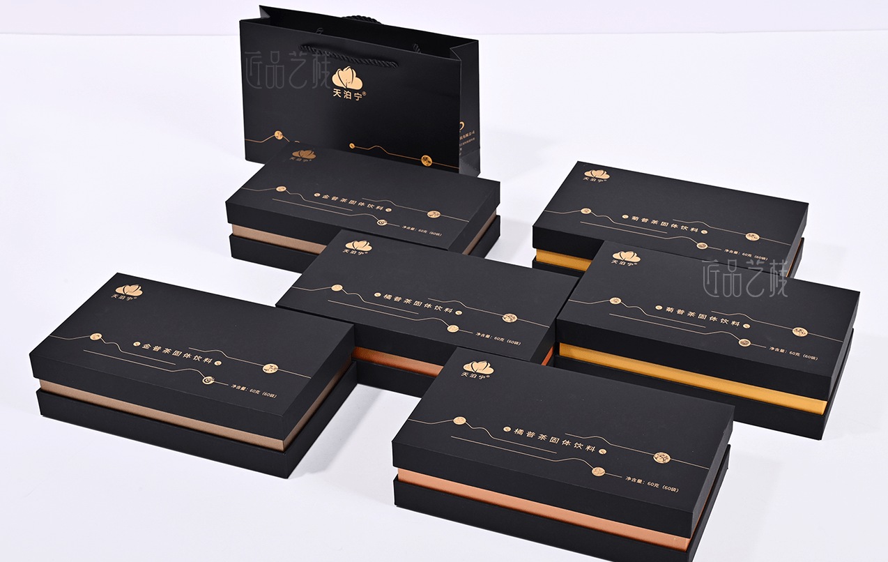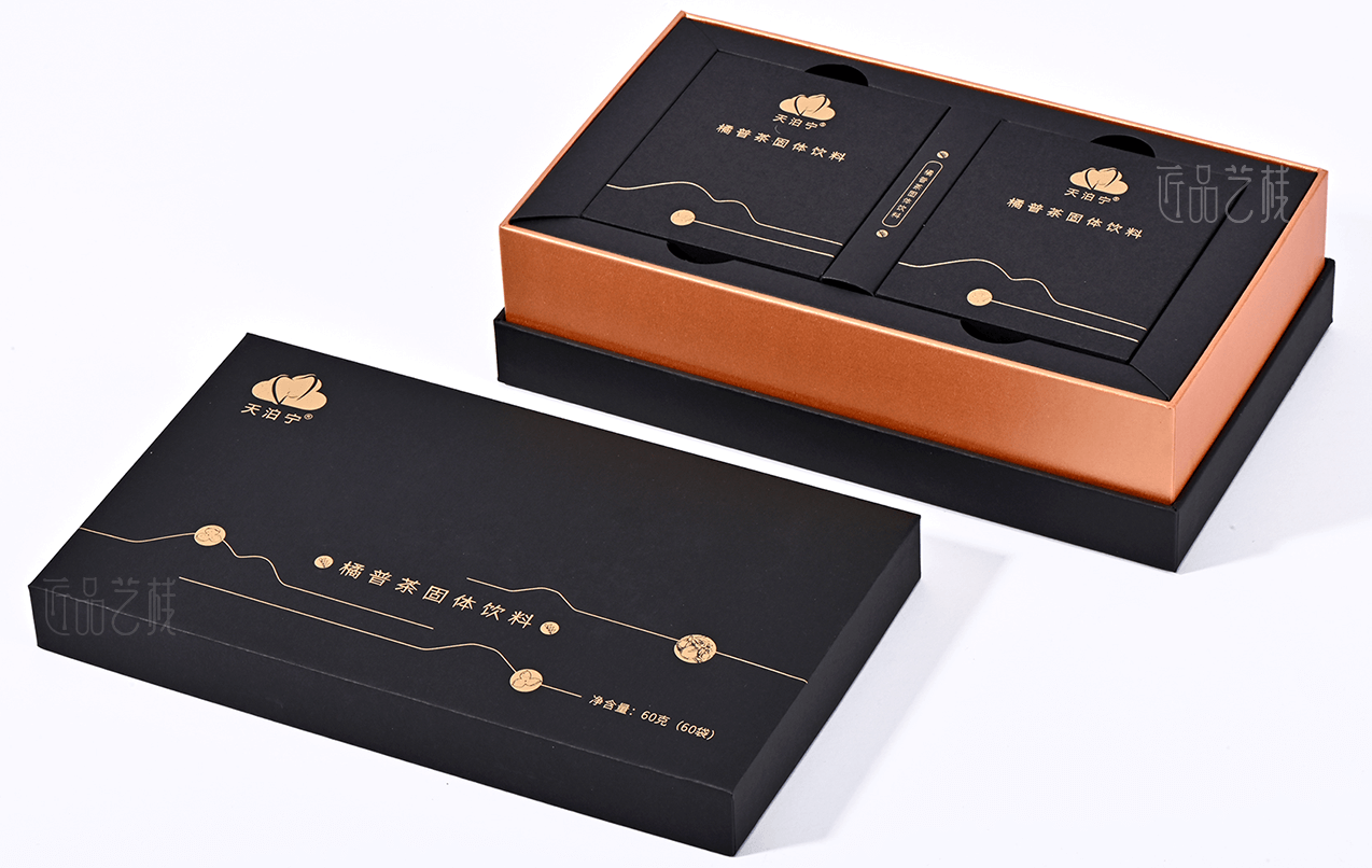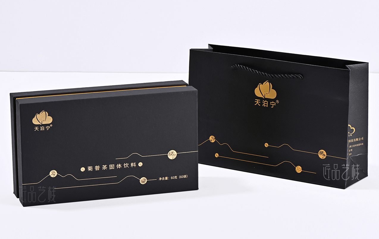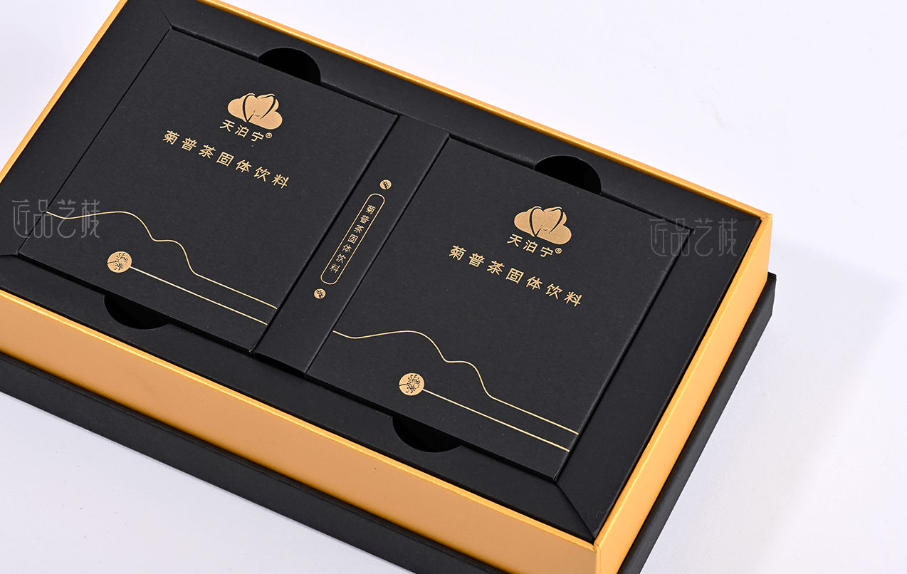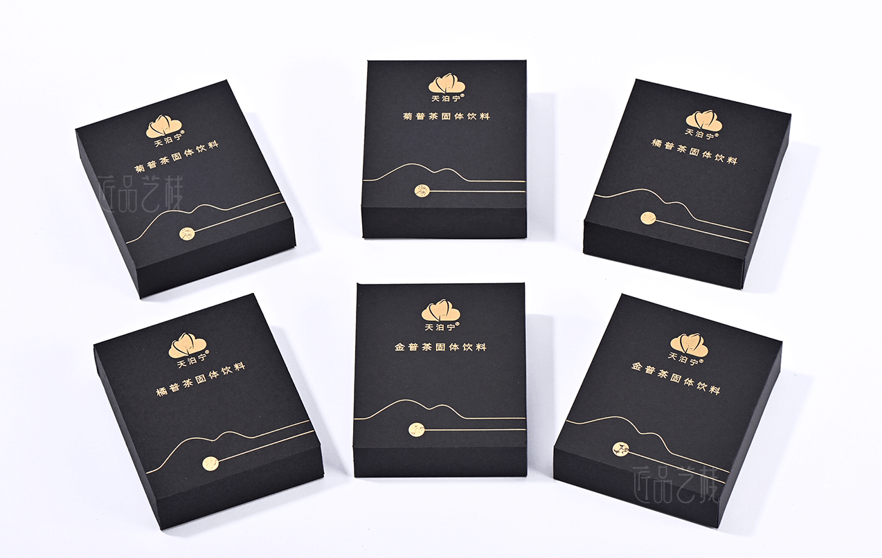 繪云生物普洱茶粉固態飲料,選用上等大葉種普洱茶,經現代生物技術深度提取而成的精華茶粉。在對該品牌產品包裝盒定制中,佳潤隆包裝&匠品藝棧,采用黑卡紙為統一外包裝,并根據其菊普、橘普、金普三大產品系列,運用不同與產品相關連的特種金卡紙為圍條點輟,使繪云生物普洱茶粉包裝盒達到既統一品牌形象和銷售體驗,同時又形成一定的差異特點,更易于消費者識別和喜愛。