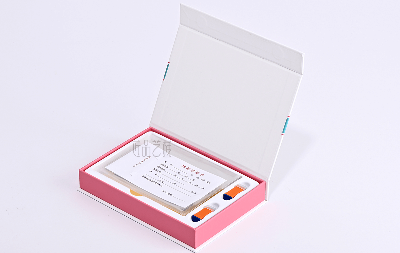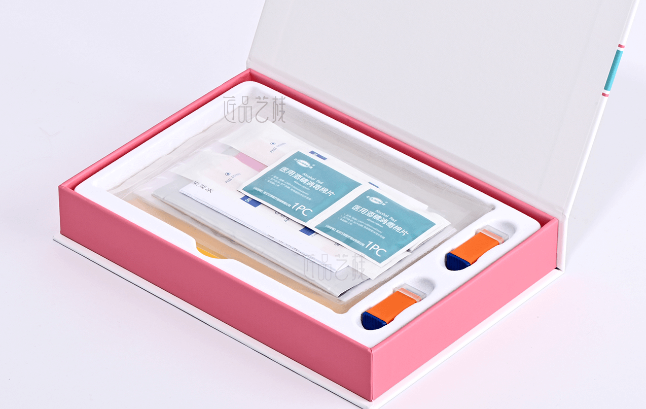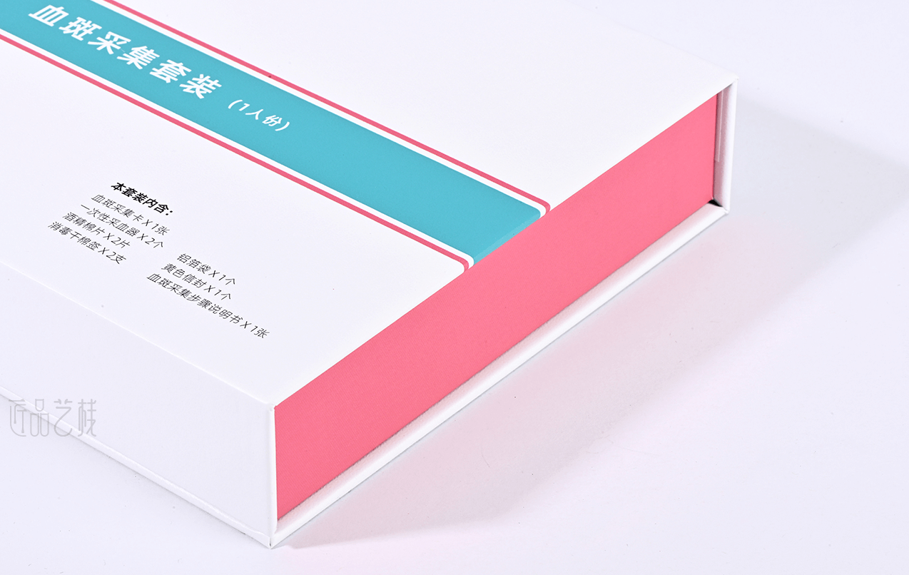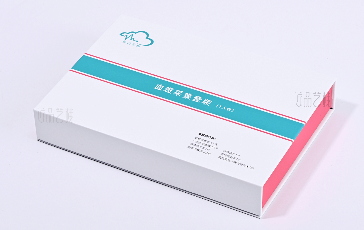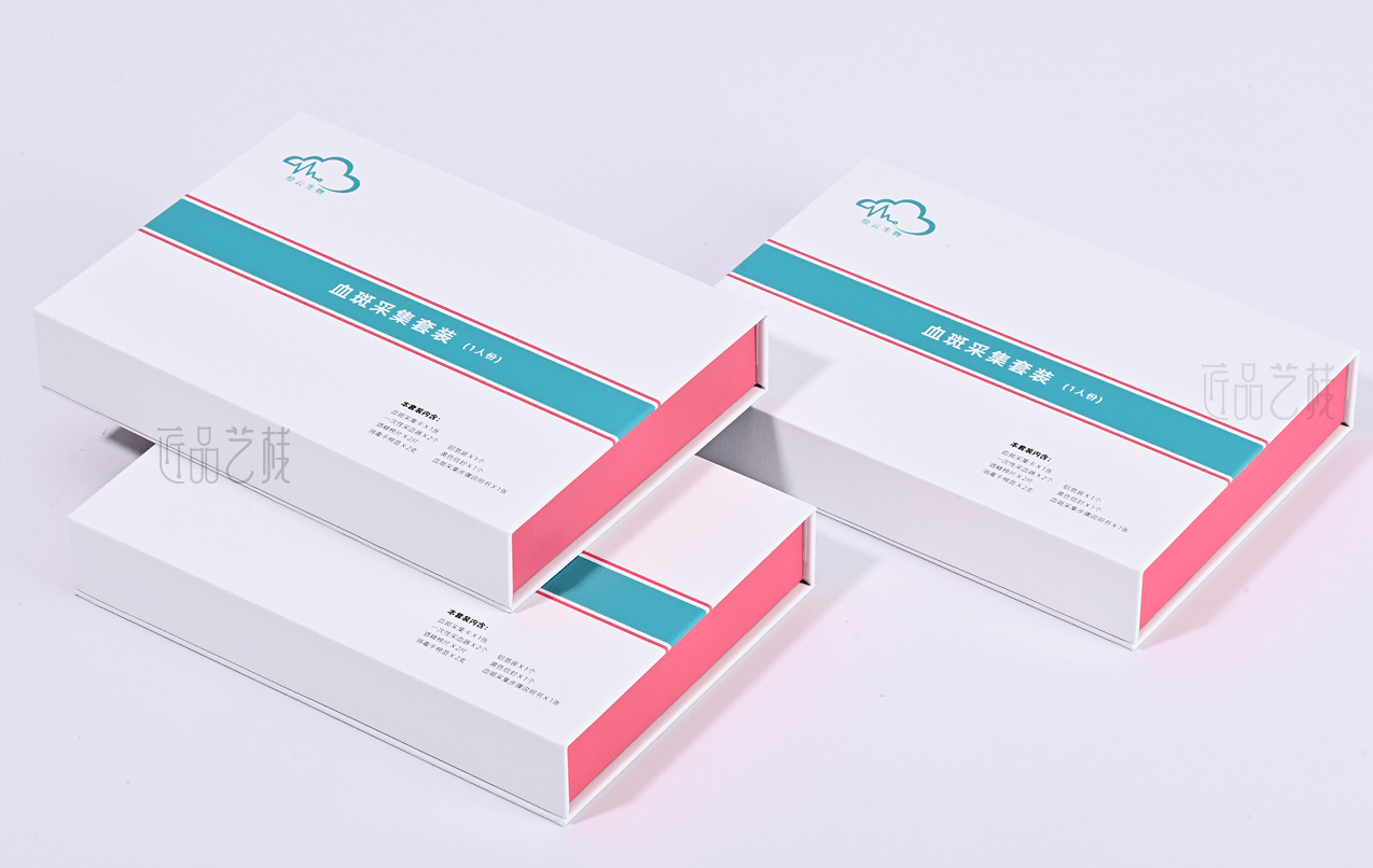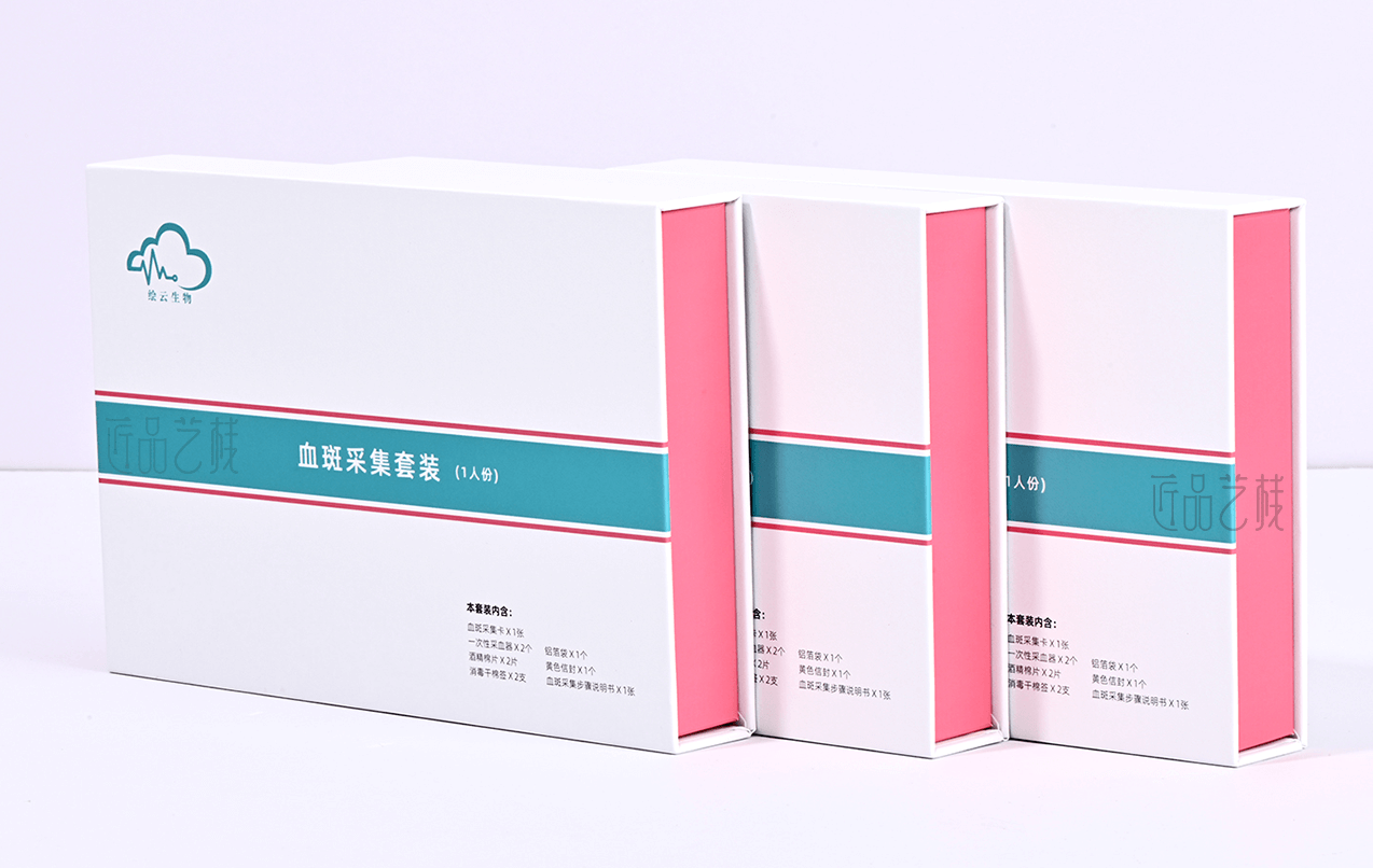 佳潤隆印刷&匠品藝棧,在與擁有一系列具有自主知識產權的體外診斷試劑盒、智能輔助軟件和健康飲品,并提供多項科研和醫學檢驗服務的繪云生物科技企業合作中,采用精致的吸塑合理設計其產品內呈現方式,以簡約的科技藍和產品血斑粉紅色為搭配設計,運用特種紙張和硬卡灰板搭配精裝制作而成,為該產品在大健康試劑檢測領域脫穎而出,提升產品給消費者的良好體驗和銷售價值。