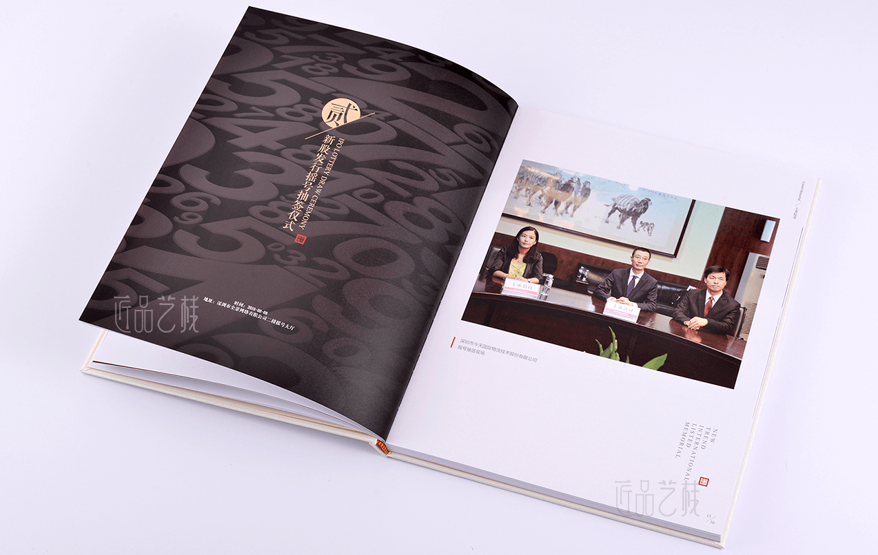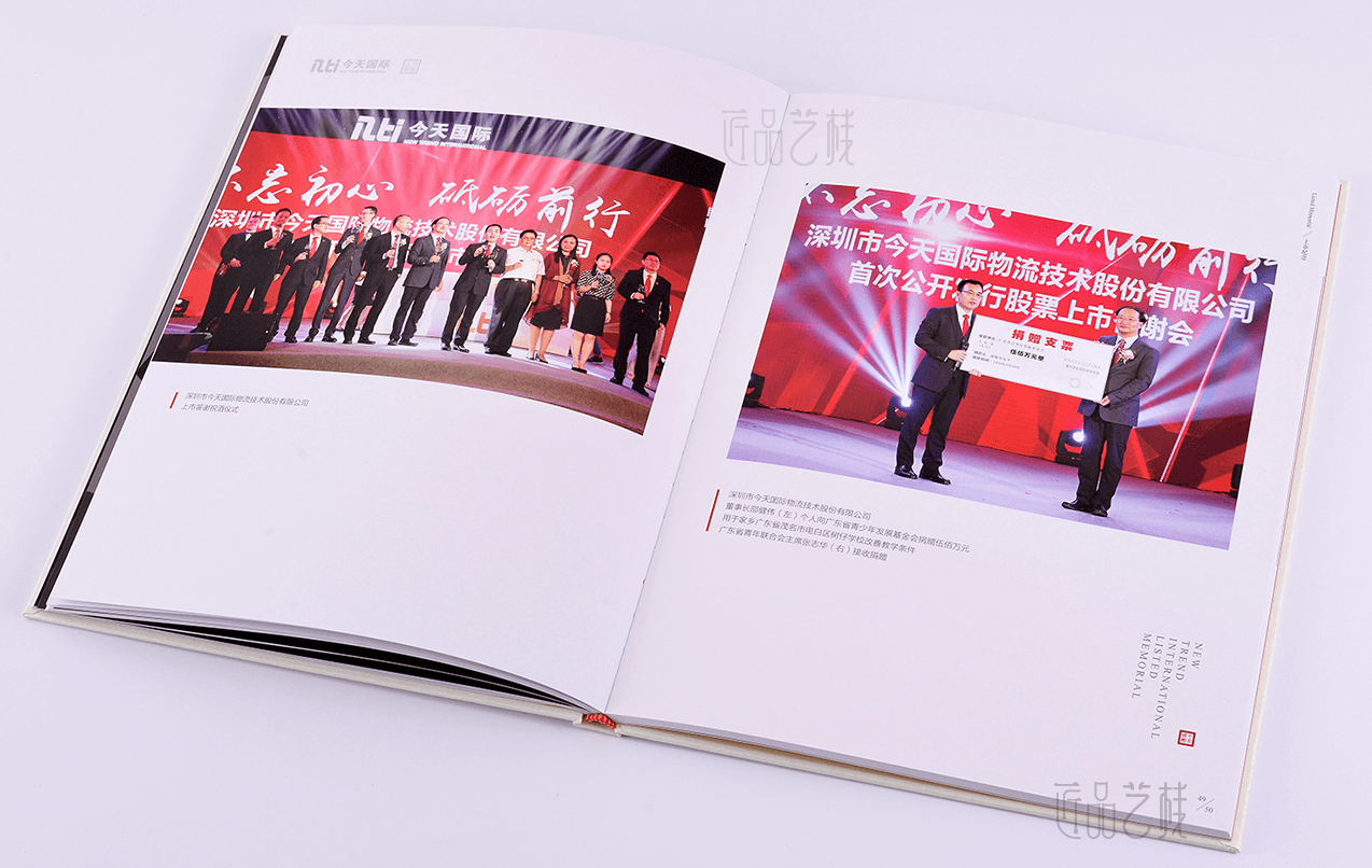 深圳今天國際物流技術公司,于2000年在深圳成立,股票代碼:300532。在今天國際上市之際,我們采用以上市流程敘述的手法,以現代簡約、國際范和喜慶的風格,結合進口紙張和精裝工藝,使整本紀念冊體現喜慶并不失奢華,讓人感受今天國際企業實力的同時,加以珍惜收藏。
