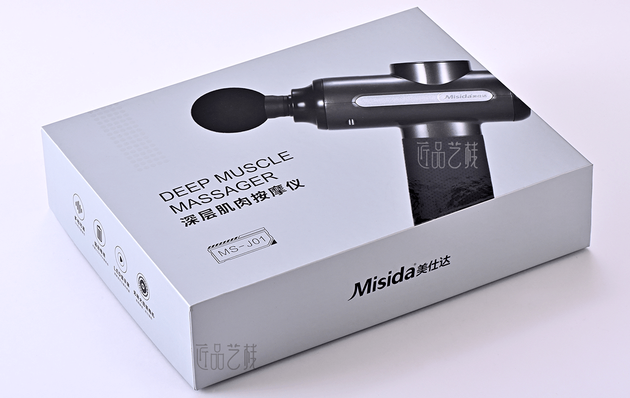 美仕達(dá)品牌,是深圳悅來科技有限公司主打品牌,亦是佳潤隆包裝印刷&匠品藝棧長期合作企業(yè)之一。在本產(chǎn)品包裝盒制作時,我們采用硬卡紙精裝的方式,海德堡五色機(jī)專銀印刷,結(jié)合逆向UV等工藝,使其襯托出相應(yīng)產(chǎn)品——深層肌肉按摩儀的厚重感和高端感,大力提升該產(chǎn)品在行業(yè)領(lǐng)域的競爭能力。