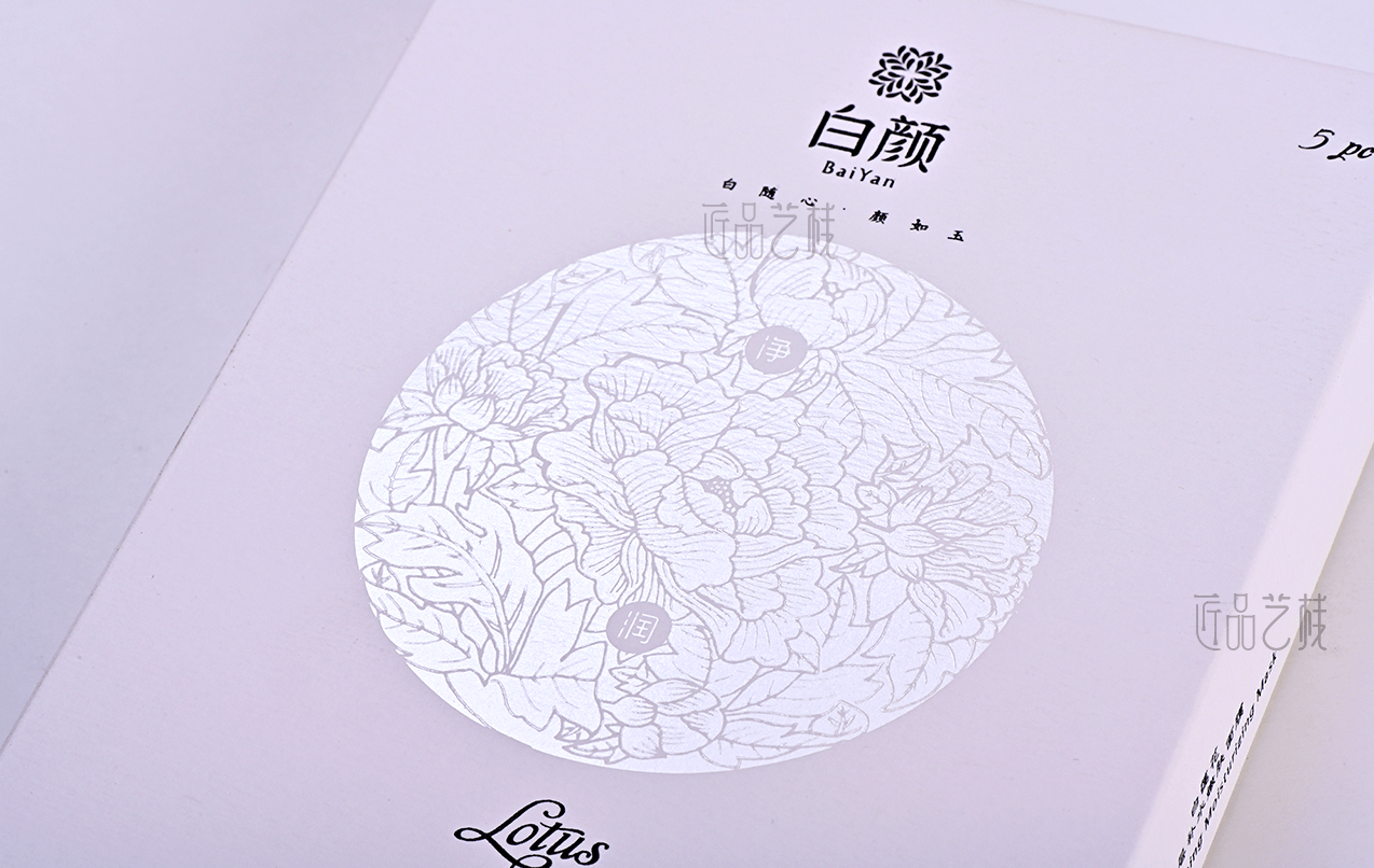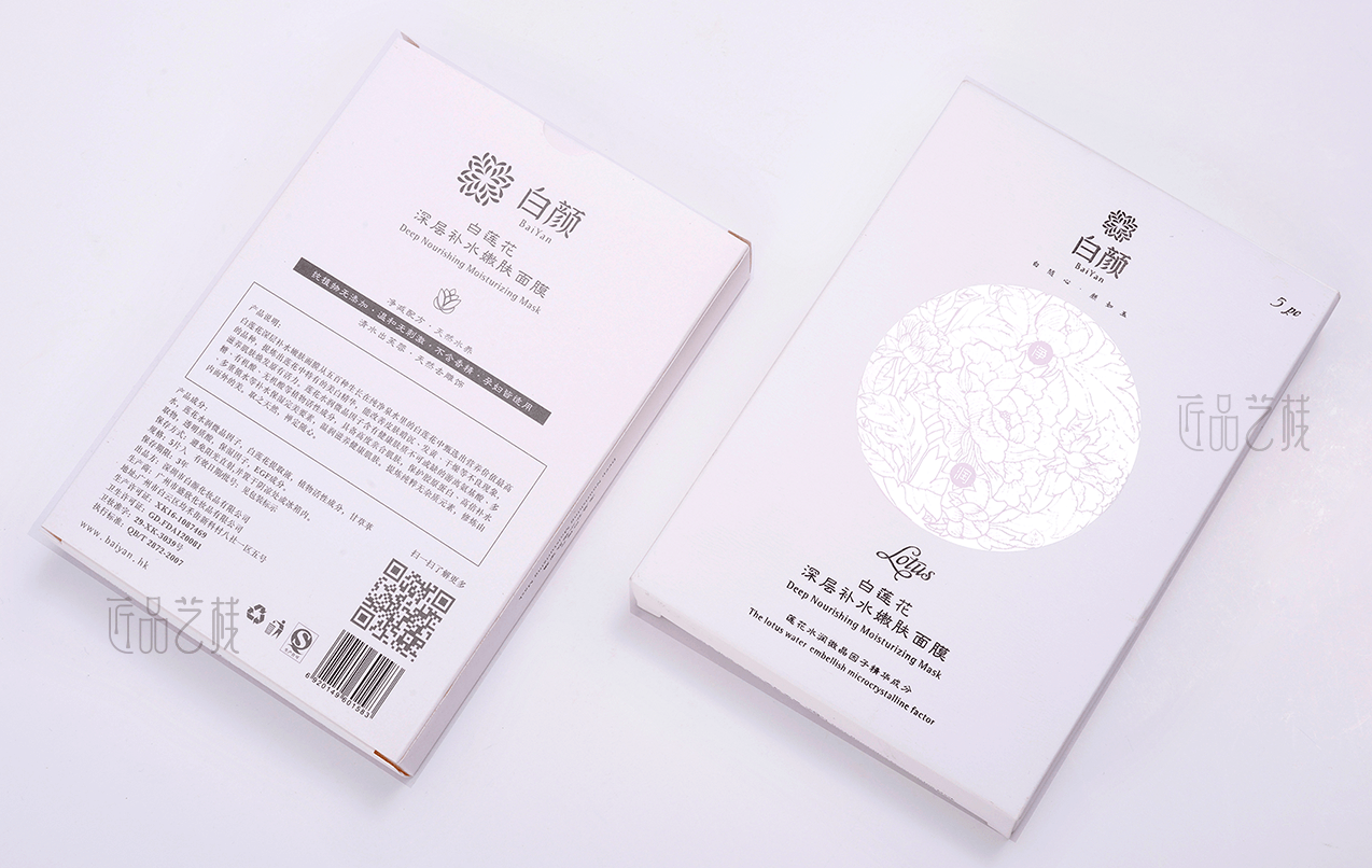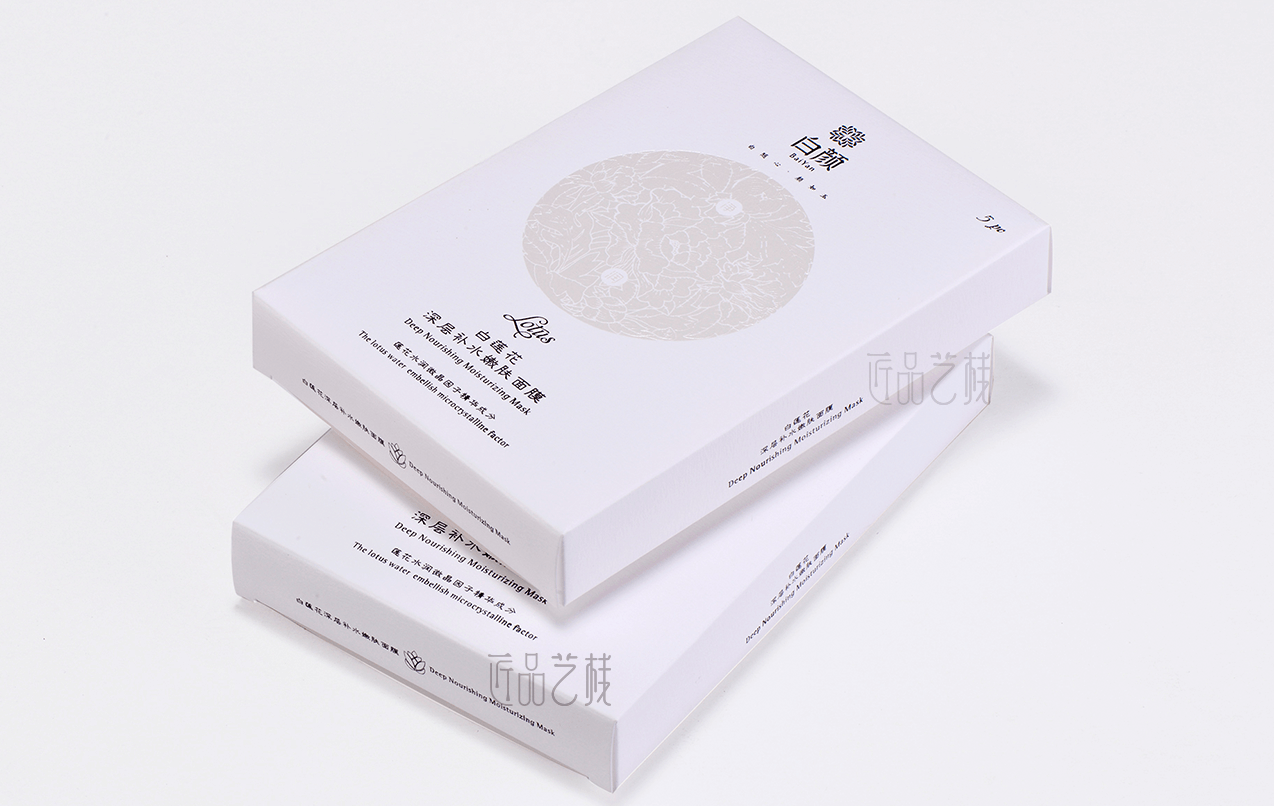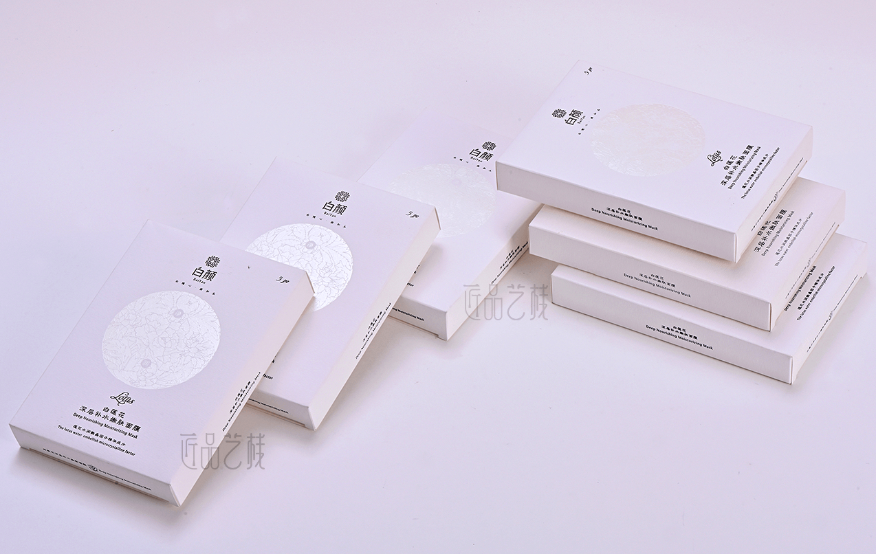 深圳白顏化妝品有限公司,旗下自主經營白顏品牌系列白蓮花深層補水嫩膚面膜,在其產品包裝盒定制合作中,佳潤隆包裝印刷&匠品藝棧采用特種白卡紙張,海德堡彩色機印刷,白色與黑色金燙印,并配置a級瓦楞紙內托,使該面膜包裝盒呈現出簡而不凡的品牌氣質。