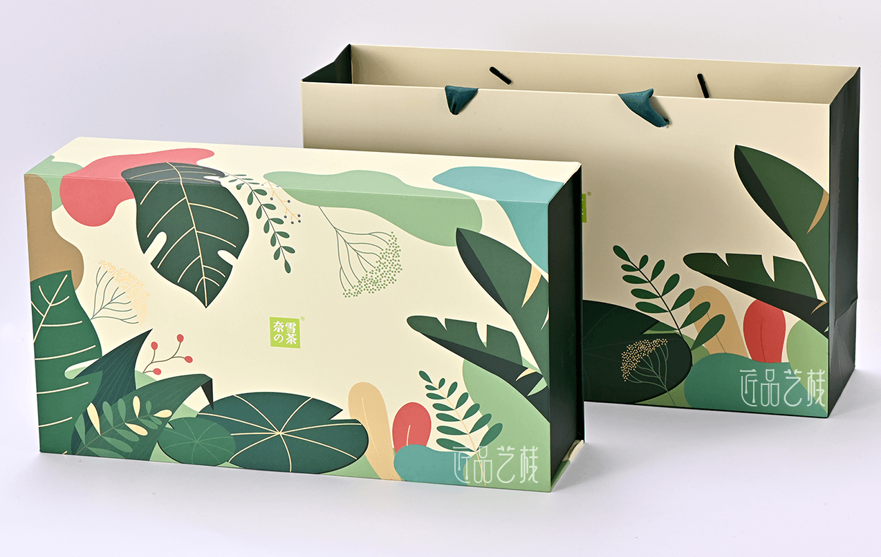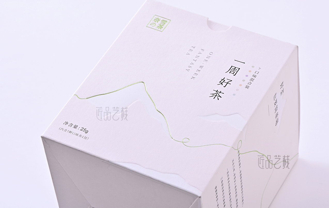 一周好茶,是奈雪的茶特別選擇了深受年輕消費者喜愛的花茶品類,以杯杯專屬新意不重樣的理念,帶來更加專注且豐富的產品升級,在其產品包裝紙盒的訂做上,亦采用簡約新潮的創新紙張,配合簡約的印刷色彩、燙金和凸印工藝,使其呈現出現代簡約、深受年輕消費者喜愛的包裝風格。